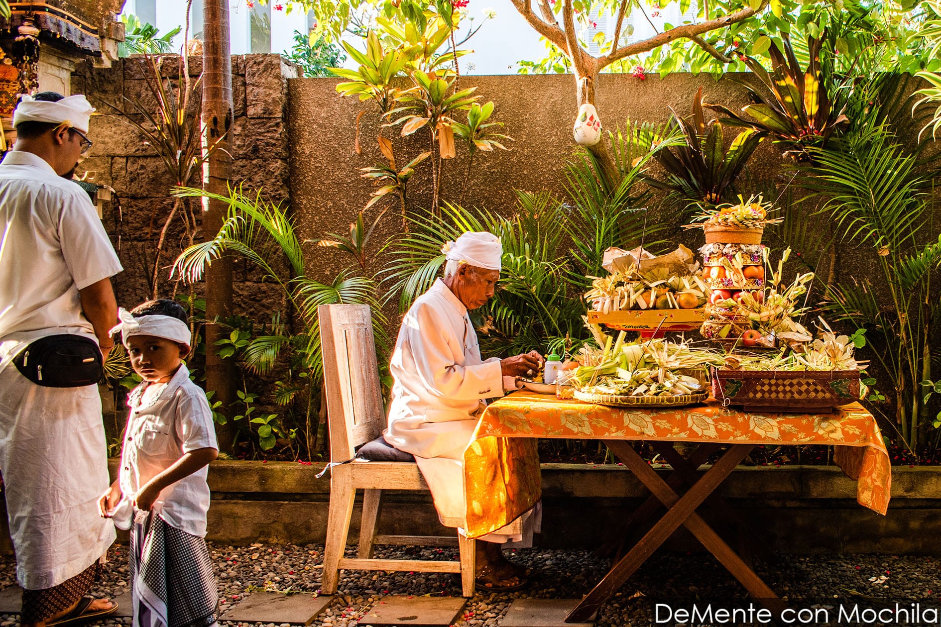 Es la primera vez que tengo un encuentro cercano con el hinduismo balinés y todo es nuevo. El señor toca una campana mientras dirige su mirada a uno de los altares en la esquina del patio. Al principio no me molesta, pero después de 10 o 15 segundo cada campanazo es un cuchillazo al tímpano. La señora que parece su esposa, camina de un lado para otro moviendo los brazos y murmurando rezos.