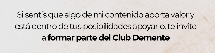 Por eso decidí abrir una puerta para quienes quieran ser parte activa de esta aventura. Capaz me seguís hace tiempo y sentís que lo que hago te toca una fibra íntima. O tal vez recién encontraste mi contenido pero te atravesó de una manera particular. Si está dentro de tus posibilidades y tenés ganas de apoyar este proyecto, llegó el Club Demente.
