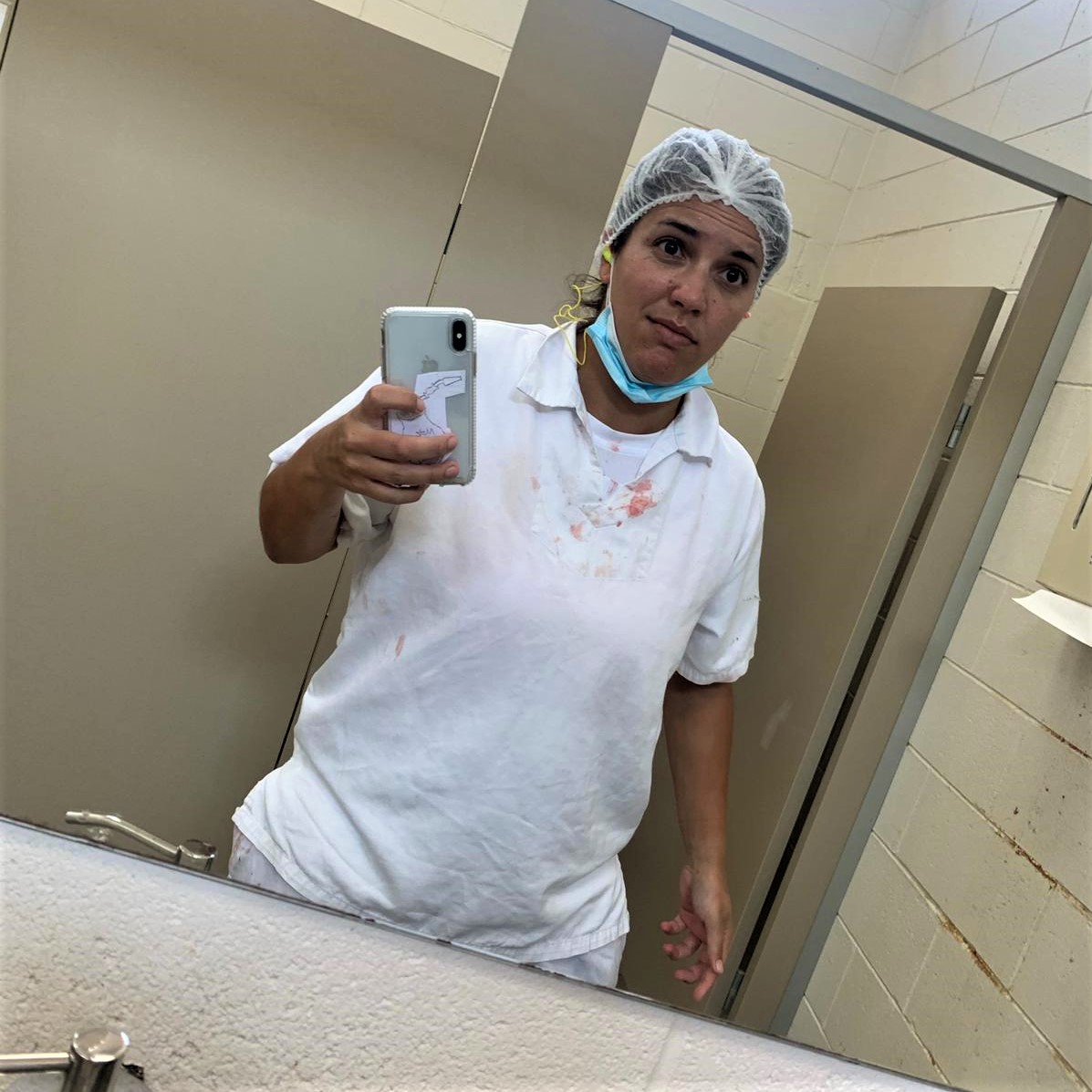 Mi tarea es sencilla pero tramposa: chequear que no quede nada de la médula espinal en la columna de la semi-vaca que me pasa por la cara cada 10 segundos. Muchas veces no tengo que hacer nada, pero más a menudo de lo que me gustaría quedo colgada como Chaplin en Tiempos Modernos, intentando cortar la médula con un cuchillo mal afilado e invadiendo el espacio de Willy, el sudanés a mi derecha que continúa la línea de producción. Mientras tanto, grasa y sangre vuelan por los aires para aterrizar, en el mejor de los casos, en las partes de mi cuerpo cubiertas de plástico.