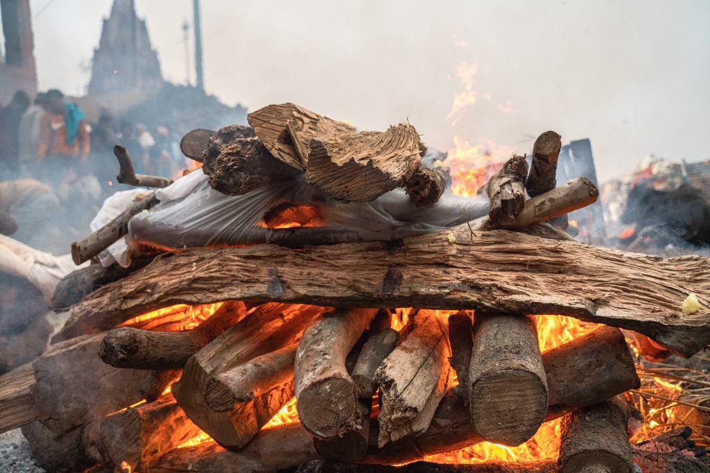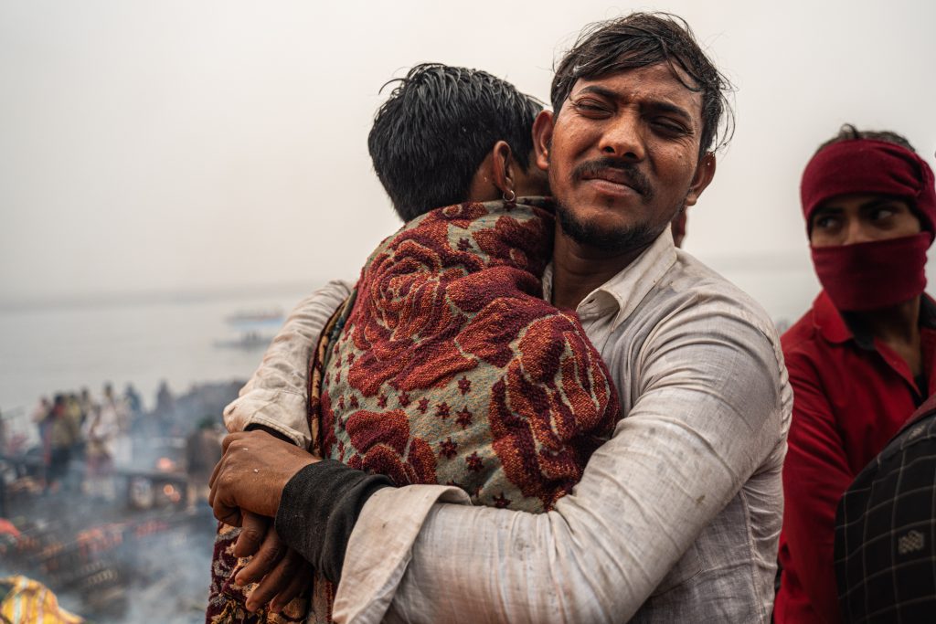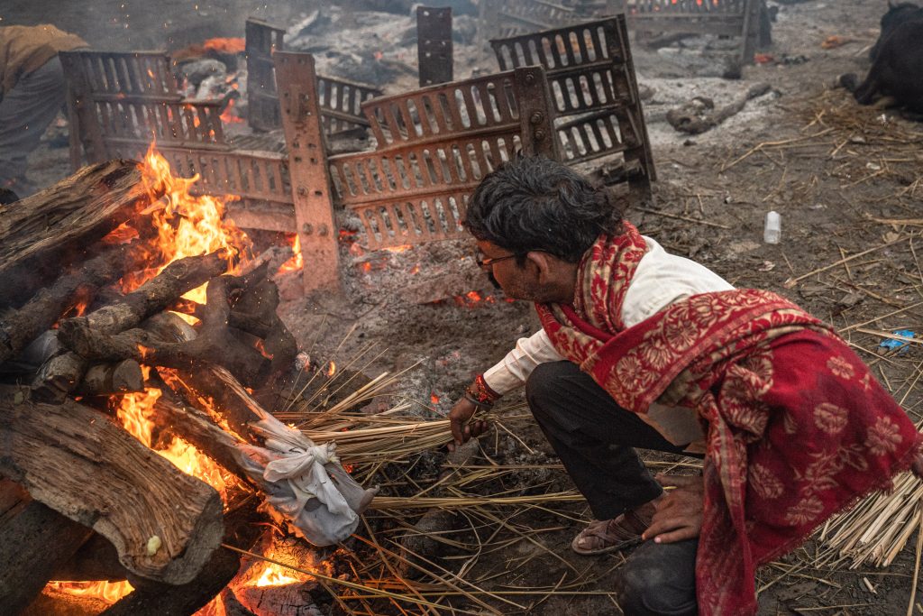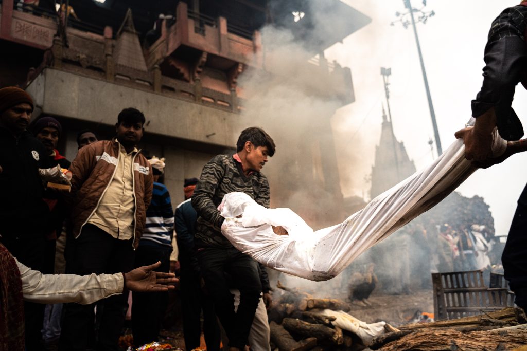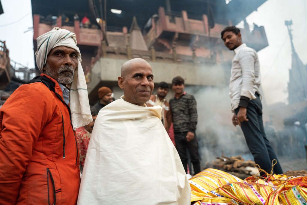 Después de caminar un buen rato encuentro la nube de humo de la que tanto había leído: Manikarnika Ghat, escalinata tradicional y crematorio más importante de Varanasi. Todos los días llegan entre 150 y 200 cuerpos todavía tibios para ser incinerados, cortar el círculo de la reencarnación y así aclanzar la liberación espiritual. Llegan al hombro de sus familiares, en largas caravanas desde otros barrios o ciudades entre flores, cantos y lágrimas tímidas que cada tanto se dejan escurrir. El varón referente, en general el hijo mayor de quien murió, se afeita la cabeza, viste de blanco y tiene que bañarse en el río antes de comenzar la ceremonia. Dependiendo de la casta a la que pertenece se le asigna un lugar para la incineración: cuanto más cerca del río más alto es el costo.