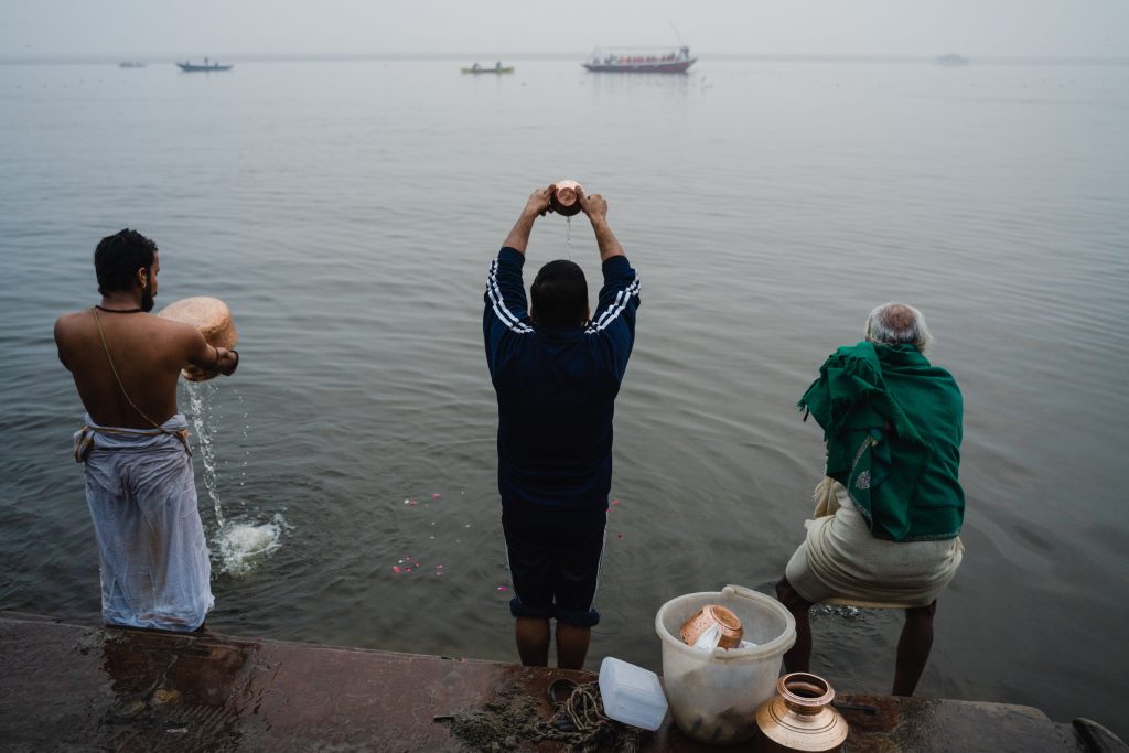 Un poco más allá, alejados de las cenizas y el humo, hay otros hombres y mujeres zambulléndose en las aguas oscuras. Repiten mantras y llenan vasijas del agua sagrada, la toman, se la tiran encima. Las imágenes se repiten en loop cada unos cuantos metros: baños purificantes, promesas divinas, niños saltando al agua y muertos viajando al más allá; todos mezclados en una convivencia que solo Varanasi puede dar.